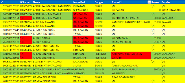 * Mengapakah Abdul Sain Bin Mahir yang lahirkan dalam tahun 1964 mempunyai nombor KP lama tetapi Abdul Sain Bin Mahir yang seorang lagi itu tidak mempunyai nombor KP lama? Menurut tahun lahir mereka, jumlah orang yang sepatutnya memiliki nombor IC lama adalah 19 orang tetapi mereka tidak mempunyai maklumat ini sedangkan pemilih yang sebaya dengan mereka memiliki nombor KP lama.